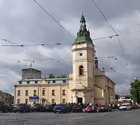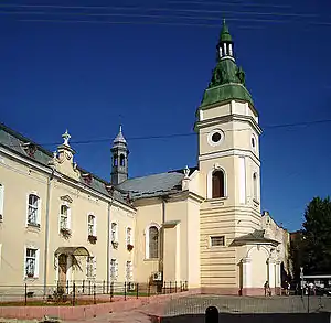 Храм розташований на клиноподібній ділянці, на роздоріжжі вулиць Городоцької та Шевченка. Зорієнтований на осі схід-захід із входом зі сходу. Мурований із цегли, зовні і зсередини тинькований. За будовою простий однонавовий з абсидою. До головного (східного) фасаду примикає вежа, а до неї — гранчастий передсінок. Зовні стіни нави підсилені контрфорсами, ізсередини почленовані пілястрами. При східній стіні нави влаштовано хори, що опираються на дві колони. У наві перекриття циліндричне без членувань, у вежі — хрестове. Вхід зроблено через нижній ярус вежі та прибудований до неї передсінок. З півдня до храму примикає двоповерхова 7-осьова із високим мансардним дахом будівля монастиря.