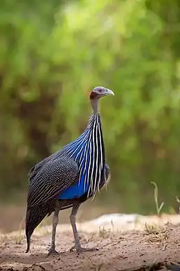 Цесарка синьогруда[2] (Acryllium vulturinum) — найбільший вид цесарок. В оперенні цього птаха присутні блискучий кобальтово-синій, ліловий, чорний та білий кольори.