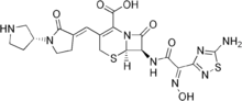 | (6R,7R)-7-[[(2Z)-2-(5-amino-1,2,4-thiadiazol-3-yliden)-2-nitroso-1-oxoethyl]amino]-8-oxo-3-[(E)-[2-oxo-1[(3R)-3-pyrrolidinil]-3-pyrrolidinilidene]methyl]-5-thia-1-azabicyclo[4.2.0]oct-2-ene-2-carboxylic acid | |