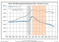 Динаміка населення з 1875 року в сучасних кордонах (Синя лінія: населення; Пунктир: відносна порівняльна динаміка населення землі Бранденбург; Сірий фон: період Третього рейху; Помаранчевий фон: період НДР)