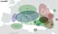 | Поширення цикламенів: 1. C. balearicum ; 2. C. repandum ; 3. C. purpurascens ; 4. C. hederifolium ; 5. C. rhodium ; 6. C. creticum ; 7. C. graecum ; 8. C. coum ; 9. C. colchicum ; 10. C. parviflorum ; C. abchasicum ; 11. C. elegans ; 12. C. alpinum ; C. intaminatum ; C. cilicium ; C. mirabile ; C. pseudibericum ; 13. C. cyprium ; 14. C. libanoticum ; 15. C. persicum ; 16. C. rohlfsianum ; 17. C. africanum | |