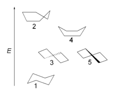 Конформації циклогексану: 1 — «крісло»; 3, 5 — «твіст»-конформація; 4 — «ванна»; 2 — «півкрісло», або «конверт»