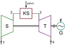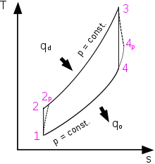 Із врахуванням відмінностей реальних адіабатичних процесів розширення і стискання від ізоентропійних, будується реальний цикл Брайтона (1—2p—3—4p—1 на T-s діаграмі)