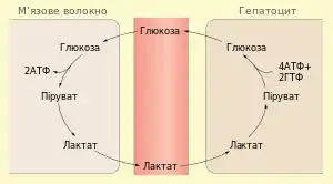 Для скорочення м'язовим волокнам необхідна енергія АТФ, вона може бути отримана у процесі аеробного окиснення органічних речовин за умови достатнього надходження кисню. Такий тип метаболізму спостерігається у більшості невеликих хребетних тварин навіть за умов великої фізичної активності. У великих хребетних, таких як людина, проте при дуже інтенсивному навантаженні кровоносна система не встигає постачати кисень до м'язів, крім того, коли скоротлива активність досягає 70% максимально можливої (наприклад під час бігу на короткі дистанції) м'язи стискають кровоносні судини і обмежують кровопостачання. В таких умовах гліколіз все ще відбувається, проте утворений піруват не може вступати у цикл трикарбонових кислот. Тому він відновлюється до лактату, за рахунок НАДH, щоб зробити можливим подальше протікання гліколізу (для чого потрібний НАД+). Утворений лактат викидається у кров і транспортується до інших тканин, де він може бути використаний як джерело енергії. Значна частина лактату транспортується до печінки, де він знову окиснюється до пірувату і використовується для синтезу глюкози в процесі глюконеогенезу. Утворена глюкоза виділяється гепатоцитами в кров і знову може поглинатись скелетними м'язами для поповнення запасів глікогену або розщеплення і отримання АТФ.