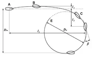 - пряме зміщення l2 — відстань від лінії початкового курсу судна до точки, з якої збігається ЦВ судна в момент зміни курсу на 90°. Середні значення лежать в межах l2=(0,5…0,6)Dц;