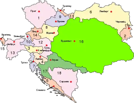 Цислейтанія (Австрійська імперія): 1. Богемія, 2. Буковина, 3. Каринтія, 4. Крайна, 5. Далмація, 6. Галичина, 7. Примор'я, 8. Нижня Австрія, 9. Моравія, 10. Зальцбург, 11. Сілезія, 12. Штирія, 13. Тіроль, 14. Верхня Австрія, 15. Форарльберг;