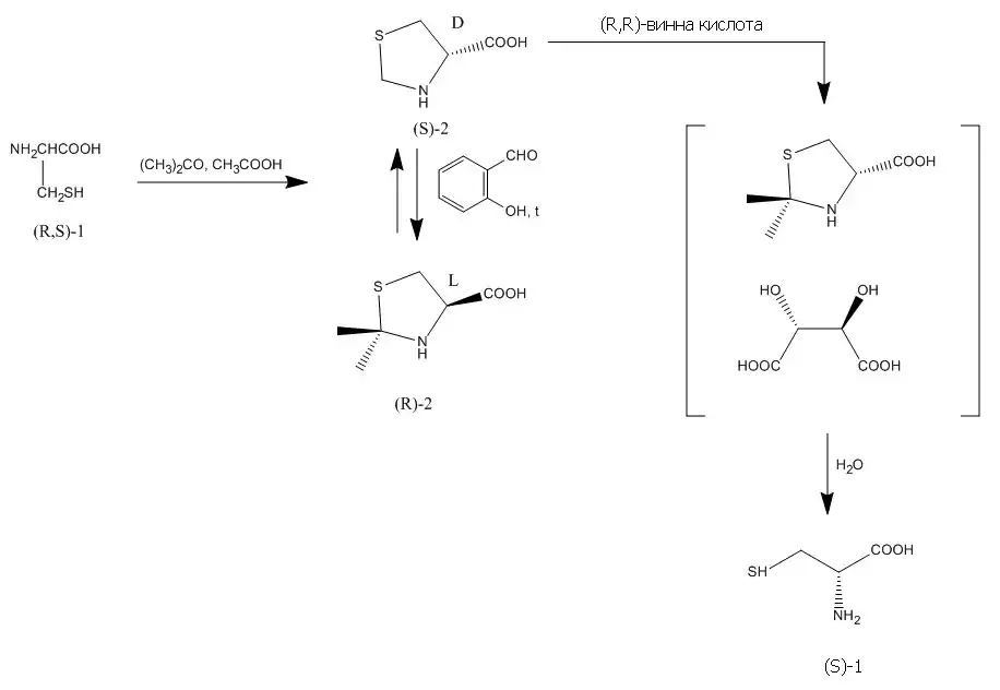 Дерацемація може бути здійсненою за наступною схемою. Спочатку (R,S)-цистеїн (1) дією ацетону у оцтовій кислоті перетворюють у 2,2-диметилазолідин-4-карбонову кислоту (2), які потім нагрівають із (R,R)-винною кислотою у присутності саліцилового альдегіду. При цьому з розчину кристалізується сіль, гідроліз якої приводить до (S)-цистеїну.