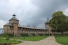 Оборонна стіна — триярусна, з галереєю на верхньому ярусі. Поділяється на два прясла. У центрі — головна в'їзна башта, на флангах — північна і південна башти. Покрита ґонтом. Висота — 8,6 м, довжина — 155,6 м.