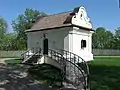 Мурована, двоярусна, зі склепінчатим льохом-підвалом. Призначалася для зберігання державного скарбу, коштовностей, клейнодів. За прототип взято пам'ятку архітектури, полкову скарбницю початку XVIII ст. з міста Прилуки на Чернігівщині, яка уособлює традиційний тип скарбниць XVII—XVIII ст., вирізняється гармонійними пропорціями, компактністю, лаконічним архітектурним декором. Покрита ґонтом. Висота — 6,65 м, площа — 27,5 м².