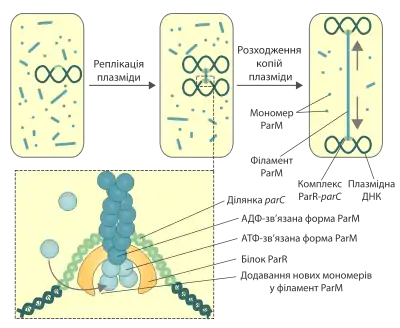 Багато малокопійних (~1-5 копій) плазмід бактерій мають спеціальні системи, що забезпечують їх розходження після реплікації. Ці механізми необхідні для того, щоб після поділу кожна з дочірних клітин отримала принаймні одну молекулу плазмідної ДНК. Відомо три типи систем, що забезпечують розходження малокопійних плазмід, у кожній з яких використовуються різні моторні білки (тип І — АТФази типу Walker A або ParA-подібні білки, тип ІІ — гомологи тубуліну або TubZ-подібні білки, тип ІІІ — гомологи актину або ParM-подібні білки). Білок ParM (від англ. partitioning motor) був вперше виявлений при дослідженні пламзіди R1 E.coli. Зараз ця система сегрегації плазмідної ДНК є найкраще вивченою.[6] Схожа система була виявлена і в інших плазмідах, зокрема тих, що відповідають за поширення стійкості до багатьох препаратів (англ. multidrug resistance).[3]