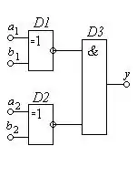На виході D1 і D2 (виняткове АБО з інверсією виходу) рівень логічної одиниці з'являється тоді, коли a1 = b1 та a2 = b2, незалежно від порівняння логічних одиниць чи логічних нулів. Тому на виході y компаратора логічна одиниця присутня лише у випадку, коли набули рівності обидва розряди двійкових чисел A і B.
