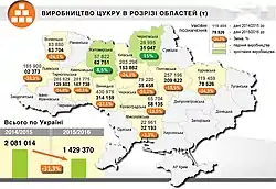 У 2017/2018 маркетинговому році (МР, вересень-серпень) Україна експортувала 560,4 тис. тонн цукру, що на 27,2 % менше, ніж за попередній МР. У 2018 році посівні площі під цукровим буряком становили 280 тис. га, що на 13 % менше, ніж минулого року. Виробництво цукру в Україні станом на 24 жовтня 2018 року склало 757,9 тис. тонн. Згідно з повідомленням Національної асоціації виробників цукру «Укрцукор», на цю дату в країні функціонувало 39 цукрових заводів, які переробили 5,89 млн тонн цукрового буряка.[4]