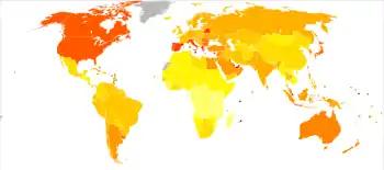 Рівень захворюваності діабетом, що у 1985 році становив 30 мільйонів випадків, збільшився до 135 мільйонів у 1995 році та до 217 мільйонів у 2005 році.[58] Це збільшення пов'язують з глобальним старінням населення, зменшенням фізичного навантаження та збільшенням рівня ожиріння.[58] До п'ятьох країн з найбільшим рівнем хворих на діабет у 2000 році відносили Індію з 31,7 мільйонів осіб, Китай з 20,8 мільйонів осіб, Сполучені Штати з 17,7 мільйонами осіб, Індонезію з 8,4 мільйонами осіб та Японію з 6,8 мільйонами осіб.[59] Його було визнано глобальною епідемією Всесвітньою організацією охорони здоров'я.[60]