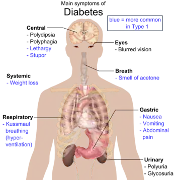 Рівень захворюваності діабетом значно збільшився за останні 50 років паралельно з надлишковою вагою. Станом на 2010 рік було близько 285 мільйонів хворих, у порівнянні з близько 30 мільйонами хворих у 1985 році. Довгострокові ускладнення від підвищеного рівню цукру в крові можуть включати захворювання серця, інсульти, діабетичну ретинопатію, що вражає зір, ниркову недостатність, при якій може бути необхідний діаліз, та недостатній кровообіг у кінцівках, що призводить до ампутації. Гостре ускладнення кетоацидозу, характерне для діабету 1-го типу, трапляється нечасто.[5] В будь-якому випадку, може статися некетотична гіперосмолярна кома.