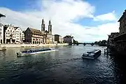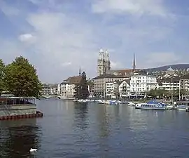 - Гроссмюнстер (Великий собор) згідно з легендою, Карл Великий виявив могили міських мучеників Фелікса і Регули і побудував першу церкву як монастир; початок нинішньої забудови близько 1100; у першій половині 16 століття Великий кафедральний собор був відправною точкою швейцарсько-німецької реформації під проводом Ульріха Цвінглі та Генріха Булінгера; оголошена імператорською церквою Карла Великого; романський склеп, романські капітелі в церкві та монастирі; вікна хору Аугусто Джакометті (1932) і Зігмара Польке (2009), бронзові двері Отто Мюнха (1935 і 1950).[6]