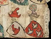 - Перший сувій містить 28 гербів зображених на прапорах (герби єпископів) та 22 герби на щитах, на яких зображені герби майже всіх країн Європи. Два з них з капелюхами пов'язують з гербом Руського (Давньоукраїнського) королівства Тризубом.