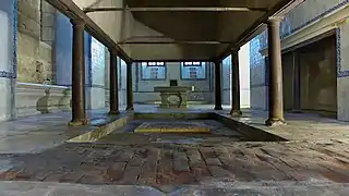 Бібліотека Джорджа Пібоді в Балтиморі (штат Меріленд), побудована 1878 року — це аналогічно складний атрій зі скляним дахом, де всі елементи конструкції також декоративні та виготовлені з чавуну. Інтер'єр бібліотеки часто розглядають як одну з найгарніших бібліотек у світі.[55] Завершений у 1878 році, він був розроблений архітектором Балтимора Едмундом Г. Ліндом у співпраці з першим ректором інституту Пібоді Натаніелем Х. Морісоном, який описав його як «собор книг».[56] Візуально приголомшливий, монументальний інтер'єр в стилі неогрек має атріум, який над черговою чорно-білою плитою з мармурової підлоги піднімається на висоту 18,59 м до гратчастого даху матового важкого скла, оточеного п'ятьма ярусами декоративних чорних чавунних балконів та золотих колонок, що містять щільно упаковані книги.