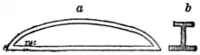 Тредгольд в 1824 році запропонував для мостових балок так званий двотавровий перетин, що складається з вертикальної стінки і двох горизонтальних поясів. Для заощадження матеріалу вигідно зробити балку міцнішою десь у середині, а кінці полегшити відповідно до необхідного опору. Для раціонального розподілу матеріалу в чавунній балці їй повинна бути надана форма, зображена на малюнку. Нижній пояс чавунної балки робиться ширше верхнього, згідно з властивістю цього матеріалу, що чинить опір стисненню більше, ніж розтягуванню.[28]
