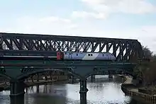 Поки чавун ще не був витіснений залізом, намагалися створити балки з обох матеріалів разом, посилюючи нижні частини чавунних балок залізними стяжками. Система ця застосована у 1849 році Джорджем і Робертом Стефенсонами до будівництва одного з найгарніших залізничних мостів у Англії 19 століття, біля Ньюкасла, через річку Тайн. Середня частина мосту складається з 6 прогонів по 125 футів (38,1 м). Міст цей двоярусний, для залізничних проїздів (вгорі) і для екіпажного й пішохідного руху (внизу). Прагнення до спільного застосування чавуну і заліза, відповідно до особливих властивостей кожного з цих матеріалів, привело Сквайєра Віппля (англ. Squire Whipple) у Америці до думки скласти наскрізну ферму, у якій частини, що стискаються за вигинанні, тобто горішній ярус і стійки складаються з чавуну, а елементи, що розтягуються — нижній пояс і косці — з залізних тяжів, або струн.[28]