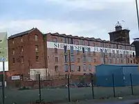 Льнопрядильна фабрика у Дітерінгтоні, одному з районів міста Шрусбері у графстві Шропшир в Англії, побудована у 1796 році за проектом архітектора Чарльза Бейджа, вважається першим будинком, зведенним з використанням чавунного каркаса — конструкції, складенної з чавунних колон та балок. Чавунний каркас підтримував цегляні дугоподібні склепінчасті стелі та підлоги, застелені цеглею. Зовнішні стіни будівлі вимуровані цеглою.[10][11] Будинок зведено у георгіанському стилі. Використання металевих конструкцій було запропоновано бажанням уникнути використання деревини у будівництві і тим самим зробити будівлю льонопрядільні пожежобеспечною, бо на той час пожежі на таких фабриках були частим явищем. Крім того, використання відносно тонких чавунних колон дозволяло замінити масивні кам'яні або цегляні колони і тим самим значно збільшити площу виробничих приміщень при тих самих зовнішніх розмірах будівлі.[11]