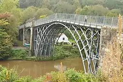 При будівництві першого в світі чавунного мосту — аркового Залізного мосту через річку Северн у графстві Шропшир в Англії, що був побудований у 1779 році, несучі конструкції мосту були виготовлені з чавуну і були такими, які до того використовували при будівництві дерев'яних аркових мостів. Це був перший металевий міст, до його будівництва не існувало теорії, тому будували як дерев'яний міст. Вага чавунних матеріалів мосту становить 378,5 т.[9] Ферми моста, у кількості 5, складені з 10 аркових косяків, поєднаних у ключі болтами. Косяк складений з 3 концентричних дуг, поєднаних поперечним брусками.