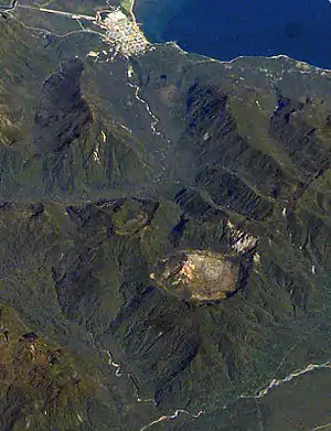 ![]() Вид вулкана з космосу. Кальдера - кругла структура в центрі. Місто Чайтен - праворуч. Верх зображення направлений на південний схід. | ||||