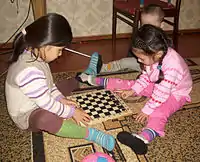 ![]() Діти грають у Чапаєва. Дошка повернена на 90 °, щоб шашки не "спотикалися" об місце згину. | |