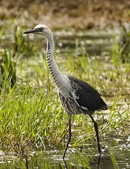 Це велика чапля (до 90 см завдовжки), з темними крилами і тілом, і білою головою і шиєю. Проживає на прісноводних водно-болотних угідях та вологих луках. Живиться рибою, жабами, комахами і рептиліями. Гніздиться на сухих або живих деревах неподалік від прісноводних водно-болотних угідь.