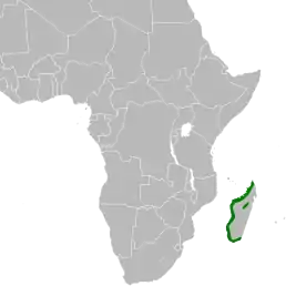 Вид поширений на Мадагаскарі (вздовж західного та північного узбережжя, на озері Алаотра). Залітні птахи спостерігалися на Коморських островах, Майотті та острові Альдабра.