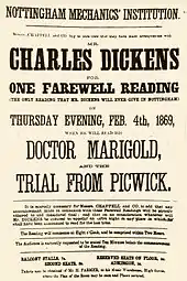 Коли проблеми зі здоров'ям минули й Дікенс набрався сил, він, заручившись згодою лікаря, організував останню серію читань з метою хоча б частково відшкодувати спонсорам витрати, яких вони зазнали через його недугу. Планувалося 12 виступів з 11 січня по 15 березня 1870, останнє в Сент-Джеймс-холі в Лондоні. Почуваючись на ту пору вже зле, він прочитав «Різдвяну історію» та витяг із «Записок Піквікського клубу». 2 травня він з'явився на бенкеті в Королівській академії, де серед гостей були принц та принцеса Уельські. Дікенс виголосив спіч, особливо згадавши померлого друга, ілюстратора Деніела Маклізеля[43].