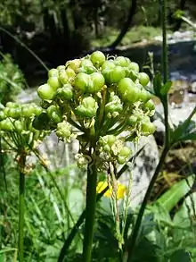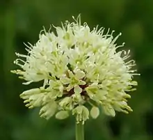Суцвіття — кулясте або, рідше, напівкулясте, досить густе, багатоквітковий зонтик, до цвітіння захований в чохол . Оцвітина зірчаста, дворядна, з шістьма пелюстками; листочки оцвітини еліптичні, білувато — зеленуваті, з малопомітною жилкою, зовнішні трохи коротші. Пелюстки еліптичні, тупуваті, довжиною 4-5 мм, білувато — зеленуваті, з одною малопомітною жилкою. Тичинок шість, нитки майже в півтора рази довше оцвітини, цільні, вузькотрикутні.