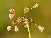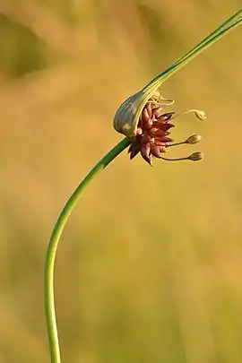 Ця багаторічна рослина від 20 до 80 см у висоту. Утворює одну або більше яйцеподібних цибулин, довжиною від близько 1,2 до 2 см і діаметром від 1 до 1,5 сантиметра. Зовнішня оболонка від коричневого до сірого, внутрішні луски цибулини від білого до світло-коричневого кольору. Стебла жорсткі, листки 5 міліметрів в ширину, з розквітом квітів вони зазвичай сохнуть. Має округлі білуваті квіти, з відтінком зеленого, коричневого чи рожевого, на довгих черешках від 2 до 4 см, з кількома або багатьма цибулинками біля основи суцвіття. Квітки дзвонові, до 7 мм довжиною. Період цвітіння з червня по серпень.