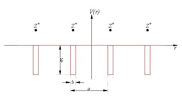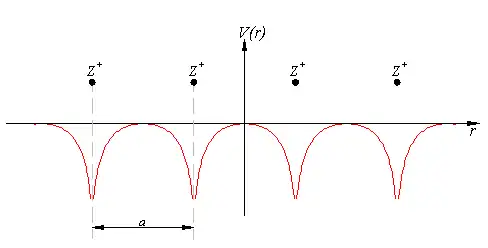 Розглянемо одномірну решітку позитивних іонів, віддаль міє якими . Потенціал в цьому випадку буде виглядати подібно до цього: