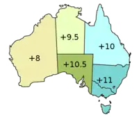 | UTC+10 | Східний стандартний час, AEST | Квінсленд, Новий Південний Уельс (без округу Янковінна), Вікторія, Тасманія, Австралійська Столична Територія, острови Коралового моря (ненасел.) |