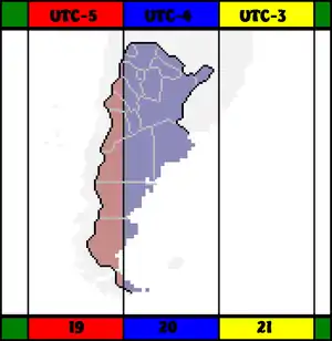 На всій території Аргентини використовується час двадцять першого часового поясу (UTC-3). На літній час Аргентина не переходить. Час, що тут використовується, називається аргентинським часом та позначається абревіатурою ART
