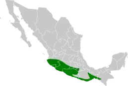 Ендемік Мексики. Поширений в південно-західній частині країни між Халіско і південно-західним Чіяпасом, а всередині країни ареал доходить до південного заходу Пуебли. Населяє первинний листяний ліс, терновий чагарник і вторинний ліс. Місцево населяє сосново-дубовий ліс, іноді трапляється в мангрових і пальмових плантаціях. Висота розповсюдження коливається від рівня моря до 2400 м.[3]