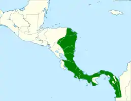 Вид поширений на сході Гондурасу, в Нікарагуа, Коста-Риці, Панамі і на заході Колумбії (департамент Чоко). Населяє різноманітні вологі ландшафти, що характеризуються густою рослинністю, як-от чагарникові зарості, вторинні ліси, поля та зріджені ліси. Він уникає глибини густого лісу, хоча може зустрічатися на його узліссі.