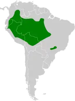 Мешкає в лісах на північному сході Болівії, на сході і південному сході Бразилії, сході Перу та Еквадору і в південній Колумбії.
