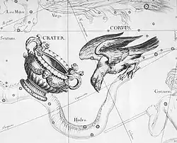 Зображення сузір'я Чаші (поруч сузір'я Ворона) на небесному глобусі Яна Гевелія «Уранографія», 1690 рік