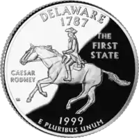 Цезар Родні верхи на коні Напис: "The First State", "Caesar Rodney" |
