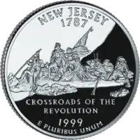 Вашингтон переправляється через Делавер, яка включає в себе Джорджа Вашингтона (стоячи) та Джеймса Монро (тримає прапор) Напис: "Crossroads of the Revolution" |