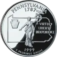 Статуя "Співдружність", обриси штату, замковий камінь Напис: "Virtue, Liberty, Independence" |