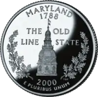 - Меріленд: Капітолій штату Меріленд, розміщений на монеті є найбільшим дерев'яним куполом в країні побудованим без жодного цвяха.[16] Деякі жителі скаржилися, що четвертак не містить зображення знаменитого синього краба штату.