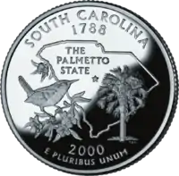Каролінський корольок (пташка штату), жовтий жасмін (квітка штату), сабаль пальмовидний (дерево штату), обриси штату Напис: "The Palmetto State" |