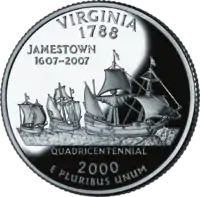 Кораблі Susan Constant, Godspeed, Discovery Напис: "Jamestown, 1607–2007", "Quadricentennial" |