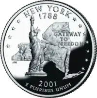 Статуя Свободи, 11 зірок, контури штату з лініями річки Гудзон та Каналу Ері Напис: "Gateway to Freedom" |