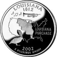 Бурий пелікан (пташка штату); труба з музичними нотами, зовнішня лінія Луїзіани на мапі США. Напис: "Louisiana Purchase" |