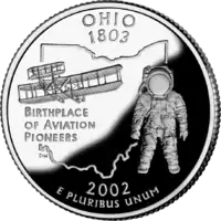 Wright Flyer (побудований братами Райт які народилися у Дейтоні, Огайо); астронавт (Ніл Армстронг родом з Вапаконета, Огайо); обриси штату Напис: "Birthplace of Aviation Pioneers" |