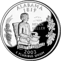 - Алабама: Четвертак Алабами перший у обігу в США з написом шрифтом Брайля .