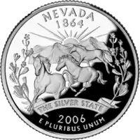 Мустанги, гори, сонце, що сходить, полин (квітка штату) Баннер з текстом: "The Silver State" |